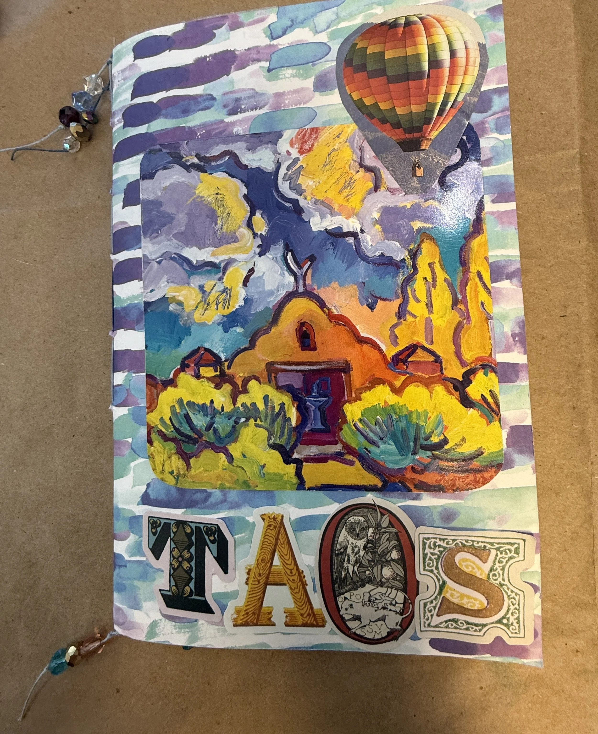 I work from a bright, welcoming studio that looks out over peaceful high desert views. It’s here that I host workshops in collage, art journaling, altered books, mixed media, and more—playful, soulful gatherings where creativity flows freely. I also lead inspiring creativity retreats in some of the most beautiful corners of the world—Portugal, France, the Caribbean, and Taos, just to name a few.